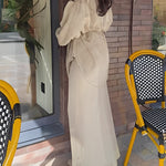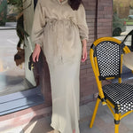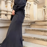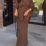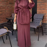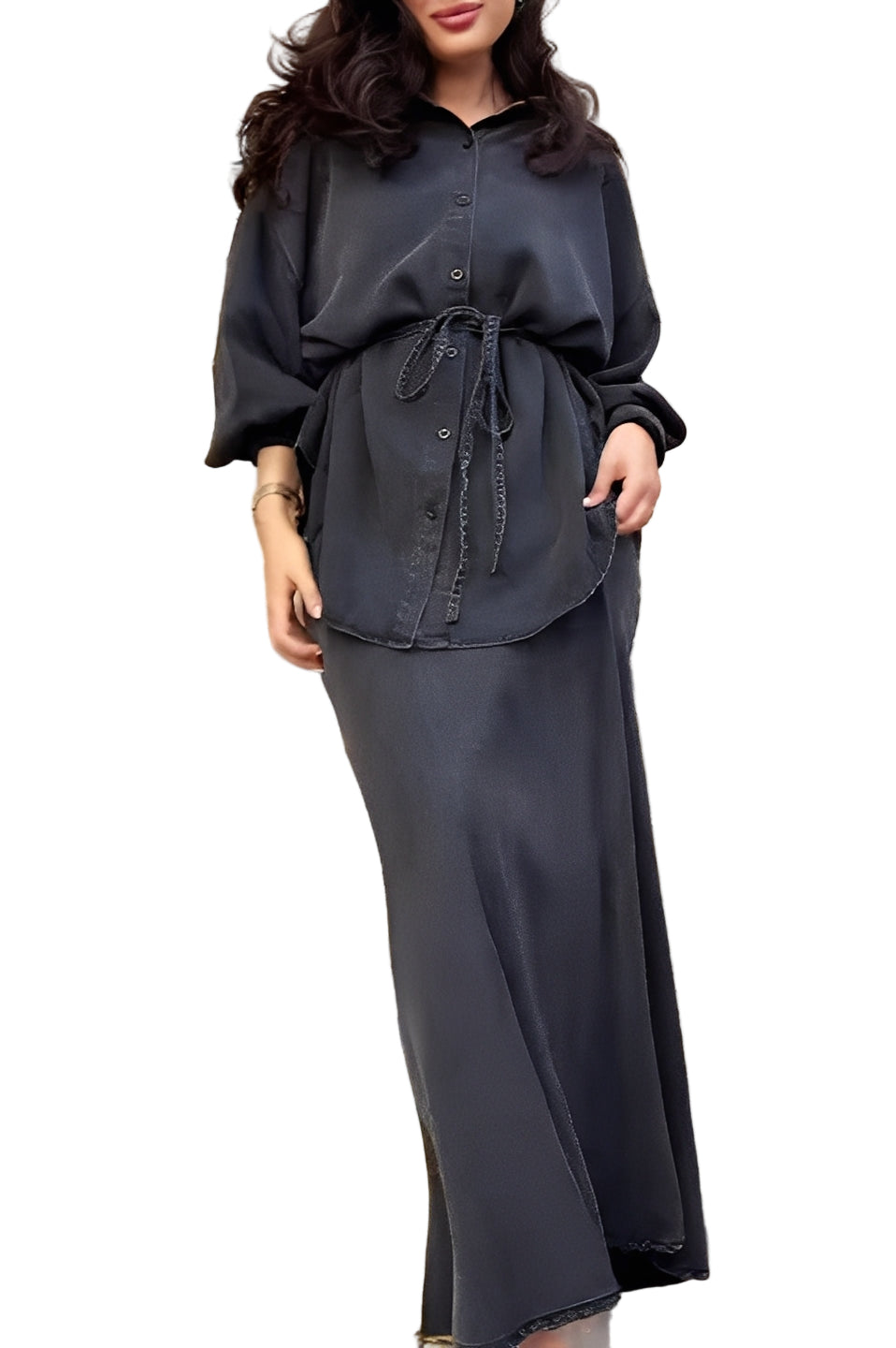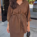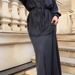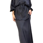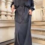 Tie Set™ kombinerer en langærmet skjorte med sløjfe ved halsen og en nederdel med snøre i taljen. Det bløde, lette materiale og det flotte fald giver et elegant, ubesværet udtryk til arbejde, events og weekenden.